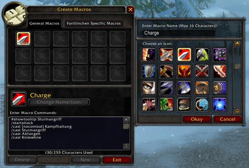 Normalerweise musst du zwischen Kampfhaltung für Sturmangriff (Charge) und Berserkerhaltung für Abfangen (Intercept) manuell wechseln. Dieses Makro wählt je nach aktuell aktiver Haltung „automatisch“ die passende Fähigkeit und wendet danach – wenn du an deinem Gegner dranstehst – Kniesehne an, um das Ziel zu verlangsamen. Und das Makro setzt natürlich auch einfach für Kniesehe ein, denn wenn du am Gegner dranstehst, wird ken Charge oder Einschreiten ausgeführt, sondern nur die Kniesehne. Alles mit einer einzigen Taste!